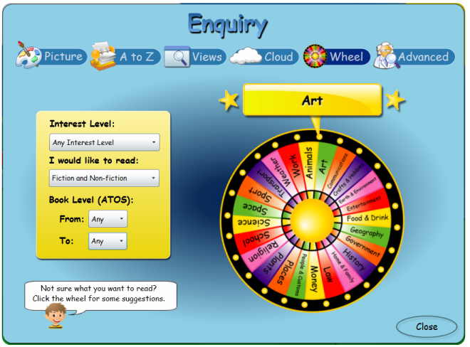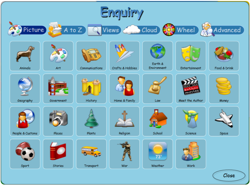 3) Choose to search using pictured categories: A-Z; filtered page Views; the Cloud; or the Wheel.