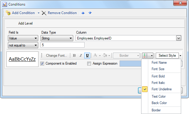 For example, you can make a text underlined for components that contain a Nancy word in the FirstName column. Select a text component with the {Employees.LastName} expression, in the DataBand and call the Conditions editor. Then, you should set a condition: select the Employees.FirstName data column, as the first value, and indicate the Nancy letter, as a second value. Also set the Operation comparison to the not equal to value. Change the formatting parameters, in this case, set the font style to underlined. The picture below shows the Conditions editor dialog box: