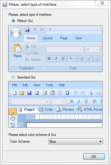 As seen on the picture, it is possible to choose either Standard or Ribbon UI. The color scheme of UI can also be changed. The following types of color themes are available: Blue, Silver, Black. The full path for invoking the Options window in the Ribbon UI: Main Menu -> Options button -> Options window. The full path for invoking the Options window in the Standard UI: Tools menu -> Options -> Options window. If you need to change the UI type before running the designer, then hold on the "Ctrl" button when loading the designer. The Select the type of GUI window will be invoked. The picture below shows Select the type of GUI window: