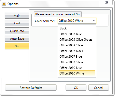 When Stimulsoft Reports.Wpf is run first the user will not see the Select the type of GUI. The designer will be loaded with the default Ribbon 2010 UI White theme. To change the type of UI, it is necessary to call the Options window in the Gui tab and make changes. The picture below shows the Gui tab of the Options window with the color themes drop down list: