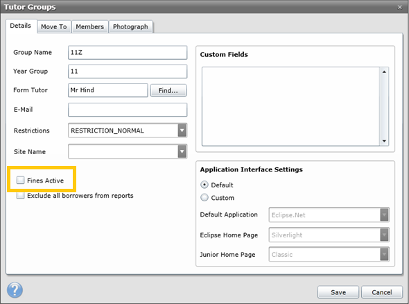 Fines can be enabled/disabled at any time by toggling this option on each Tutor Group. If the Fines Active check box is un-ticked, fines will not be generated for any Borrowers that belong to that Tutor Group (regardless of the restriction settings).