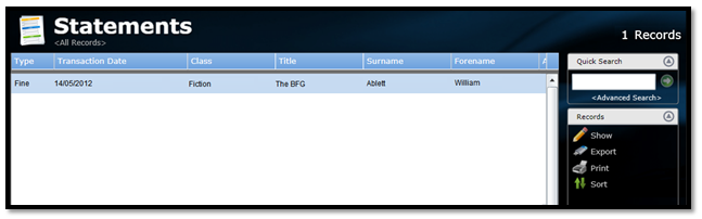The Statements table will open on-screen and will show an entire list of all transactions to occur in the system. If you click on a transaction, you can click Show on the right menu to be taken to the appropriate place within Circulate.