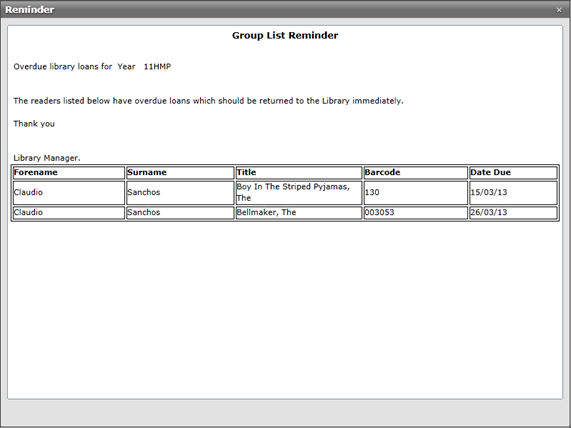 It is advisable to preview the reminder to be sure that the prospecting appearance and contents of the reminder is suitable before committing changes and running it live, against a real library borrower as doing so would incorrectly increment the reminder number.