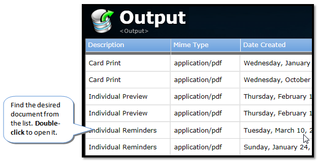 ·A list of all items in the Output table will display. There may be various stored PDF documents in here as any time some form of PDF document is generated it is also stored in the Output table. Double click the appropriate record or click Show to view the document.