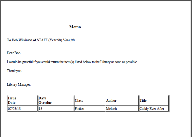 For example, the user may wish to send a memo to Year 11 leavers that may officially leave School before their exams start. A memo would remind them to bring all of their resources back to the Library, regardless of whether they are overdue or not and this would not affect their reminder number.