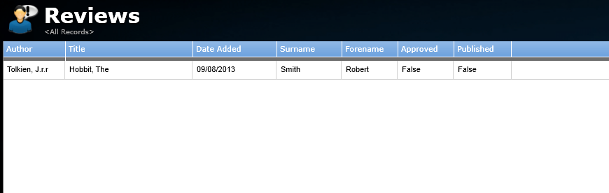 ·Open the Reviews table to view a list of all reviews. In this example there is only one review and it is currently unapproved as we can see from the approved column.
