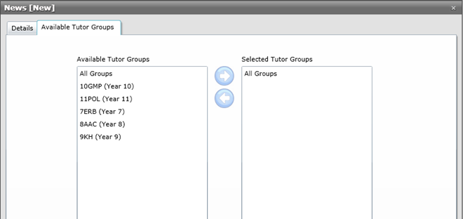 ·Use the arrow buttons to move the highlighted Available Tutor Group names from/to the Selected Tutor Groups column. Should you not wish to make the news item available to all groups, remove the All Groups item from the Selected Tutor Groups.
