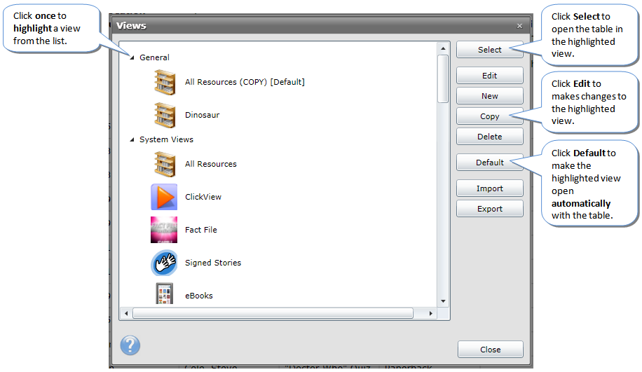·To set a default Page View (i.e. the one always seen when accessing the table), highlight the view and then click on the Default button. Notice that [Default] gets appended to the views description to indicate that it is now the default view.
