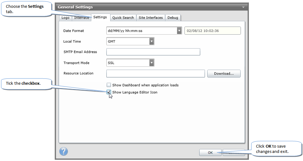 Click on the Settings tab and tick the Show Language Editor Icon checkbox. |