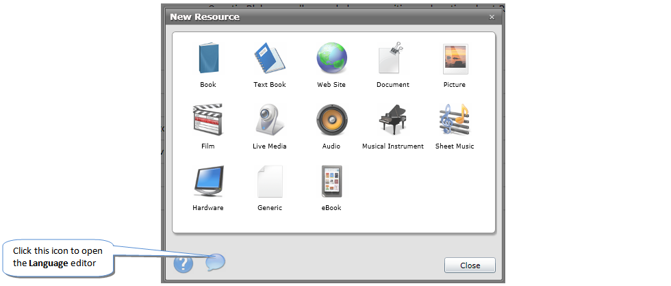 The Language editor window will appear on-screen, displaying only words/phrases specific to the New Resource feature window, from which the user has come from.