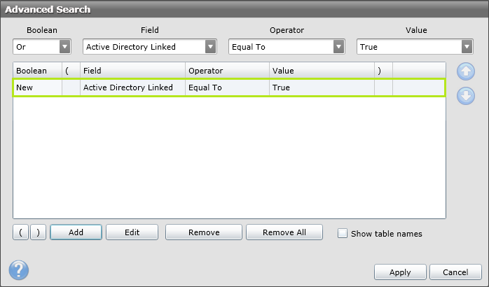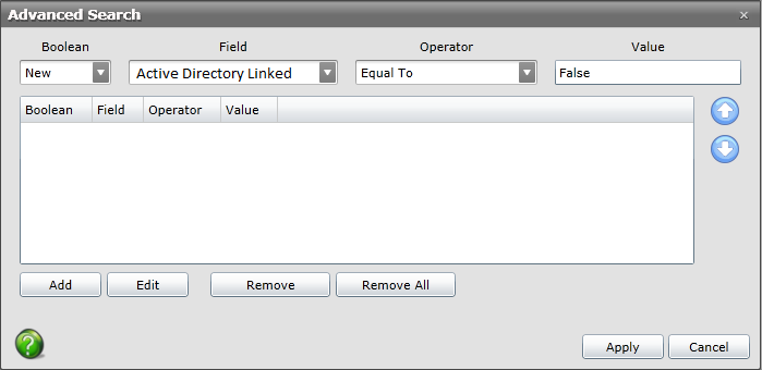 ·Perform a search by selecting New under Boolean, Active Directory Linked under Field, Equal to under Operator and select False in the value field.