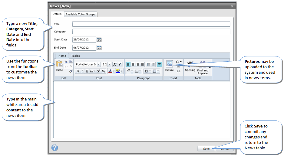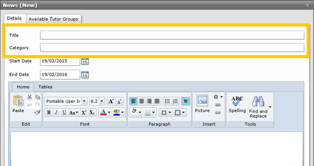 ·Next, start entering the content for the news item. Begin by entering the Title and allocate the news item a Category by typing into the appropriate text boxes.