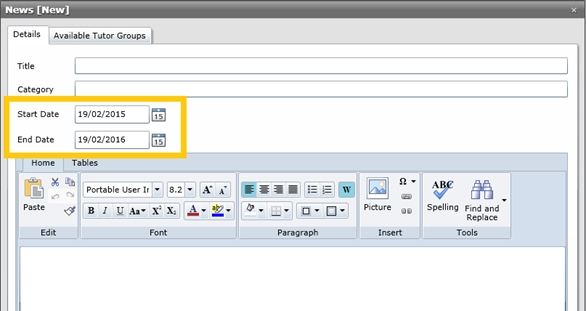 ·Next, define the dates when the news item should start and when it should end. Click on the calendar icon to select a date or type one in.