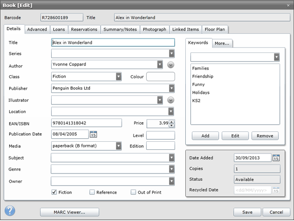 When you have catalogued 1 item and you go to catalogue another you can now select any field in the new record and press F9, the system will then copy whatever you entered in that field (for the last resource catalogued). So for example if you fill in the Location / Owner fields you can now fill it in the for the first record then just click in the field and press F9 for all subsequent resources added. This is per session, so if Eclipse.net is closed it will reset what is remembered for the F9 feature.