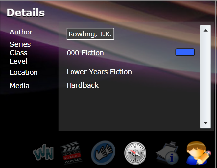 After carrying out a search the resource information in the details box has some of the fields now contained in a box. This is to highlight that you can now click on this and it will carry out a search for all resources related to that word and field. For instance, if you click on "Rowling, J.K", in the Author field, the system will display every resource with an author of "Rowling, J.K.".