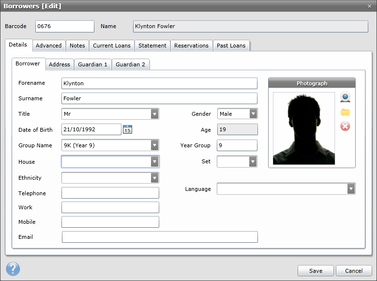 Borrower record cards now support webcams for taking photos. Next to the borrower image is a Webcam icon that can be clicked on to enable the webcam and take pictures.