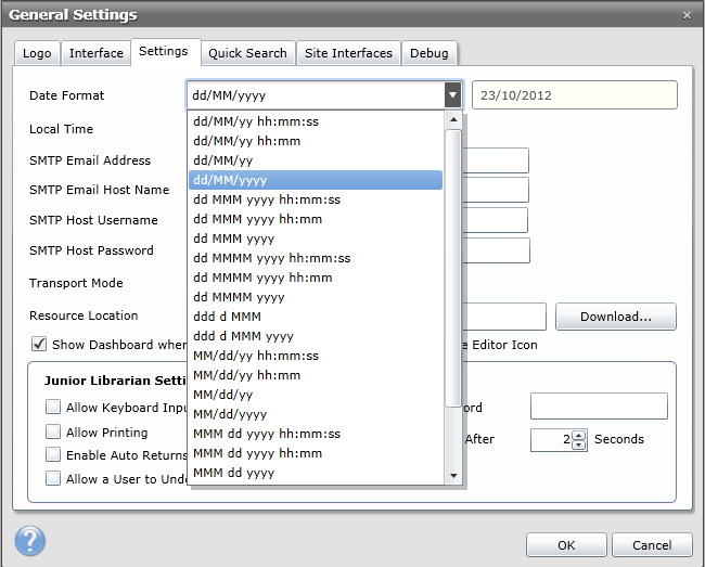 The ability to customise the date format and local time used throughout the system has been added to ‘Settings – General’: