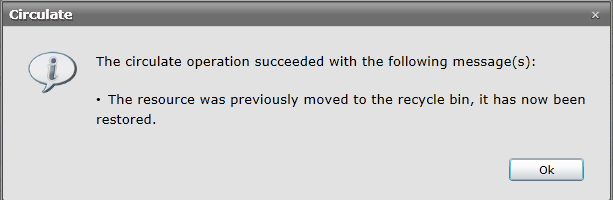 If you try to issue or return a resource that has previously been recycled (as it was thought lost / damaged / etc) it will now carry out the operation and move the item back into the live library. A message prompt will be displayed advising of this.