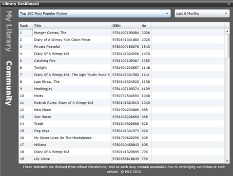 Clicking "Community" shows stats are derived from all sites using a MLS hosted system. This allows you see which books are popular across all schools, which books boys / girls are taking out most (to aid in creating reading lists / wish lists), as well as many other reports.