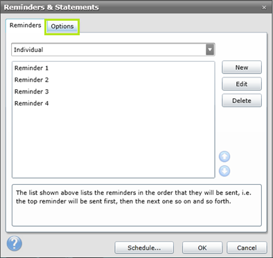 ·To change the Grouping and Sorting options of Reminders, firstly access the reminder selection interface from Settings / Reminders & Statements... at the top of the Management page.