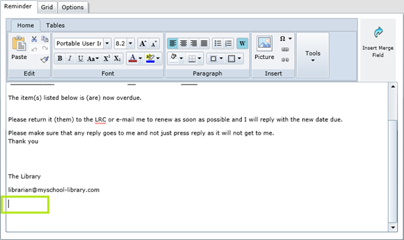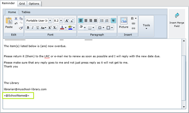 Merge fields can be used to insert variables onto any type of reminder. This is a big time saver as it means that a place-holder can be inserted which at the point of generating a reminder is substituted for the varying data, for example, a borrowers Forename and Surname.