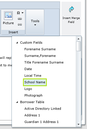 Select the required field by clicking it once to add into the reminder, in this example, the school name is being added.