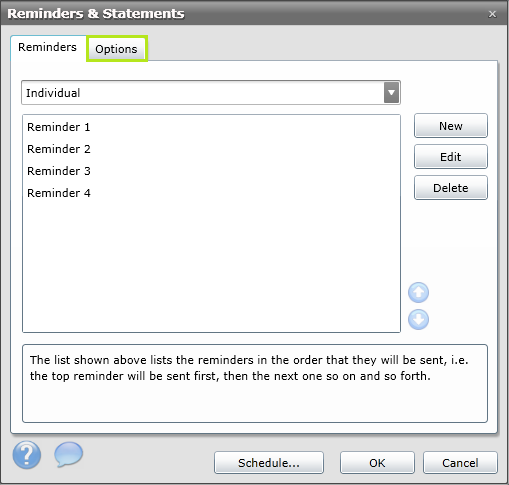 This topic explains how to alter the following settings that are only applicable to running Reminders on a scheduled basis. It is important to configure these options before generating reminders using the scheduler and they do not apply when reminders are manually generated. Once these have been defined, see the topic Scheduling Reminders for details on how to automate them.