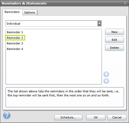 ·To change the order in which the set reminders are sent, firstly access the reminder selection interface from Settings / Reminders & Statements... at the top of the Management page.