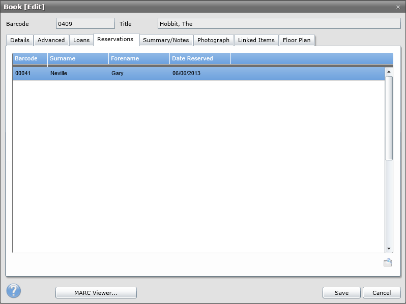Details, Advanced, Loans, Reservations, Summary/Notes, Photograph, Linked Items, Floor Plan