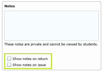 There are two types of notes that can be entered onto a book record, Public and Private notes. The Public notes are notes about the resource that are visible to the students when browsing the catalogue from the home page. Private notes are ones for the use of the librarian that display on the book record. Private notes can also be configured to display when a resource is issued/returned. To do so, check the appropriate options Show Notes on Issue / Show Notes on Return.