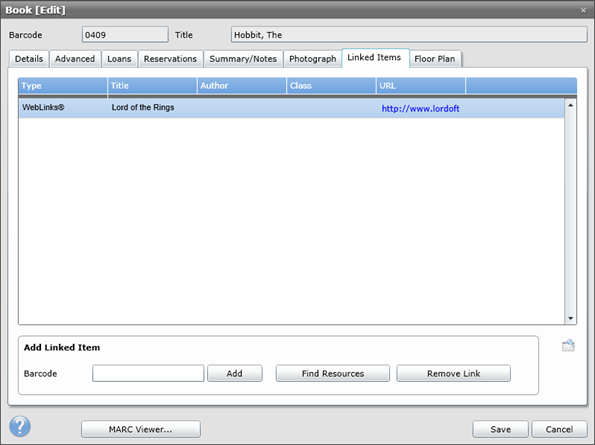 To add a linked item click Find Resource at the bottom and locate the resource. Alternatively, if the resource has a barcode then type in the number of the resource and click Barcode. To remove a link, select the item to remove in the list and click Remove Link.