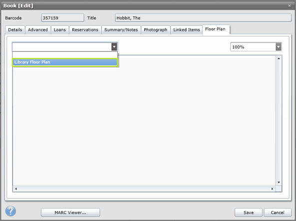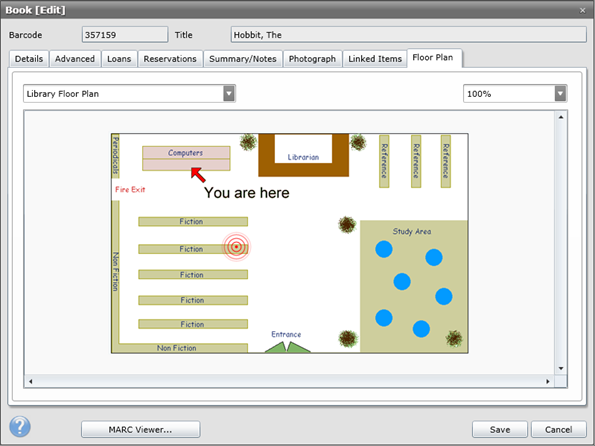 The Floor Plan tab shows the position of the resource in the library from a birds eye view. Before a location can be plotted on the floor plan for an individual resource, the floor plan must first have been created. See the topic Creating a Floor Plan for further details.