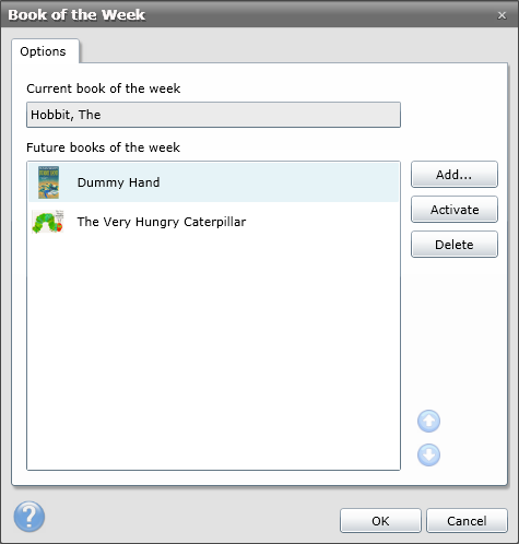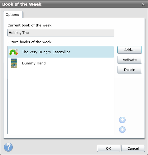 The books showing under the Future Books of the Week area are the ones next in line to become book of the week. In the example below, the book Dummy Hand is next in line to be Book of the Week, following that, The Very Hungry Caterpillar.