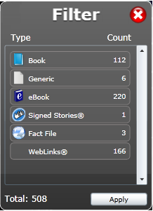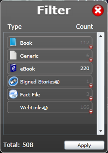 To remove resource types from the filter, click a resource type in the list. In this example, click every resource type apart from eBook and click Apply.