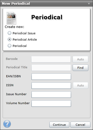 ·Notice that this automatically fills in the Title, ISBN, ISSN, Issue Number and Volume Number fields. In addition, notice that the barcode field is also unavailable. This is because an article is not a physical resource, like the Issue.
