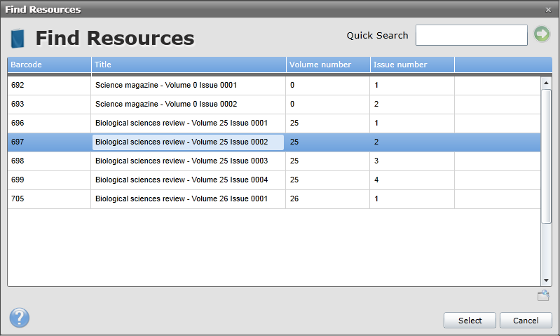 ·Next to the Periodical Title field, click the Find button. Select the Periodical Issue that you wish to attach the article to. In this example, the article is being catalogued is present in Biological Sciences Review Vol 25, Issue 2 so this is selected.