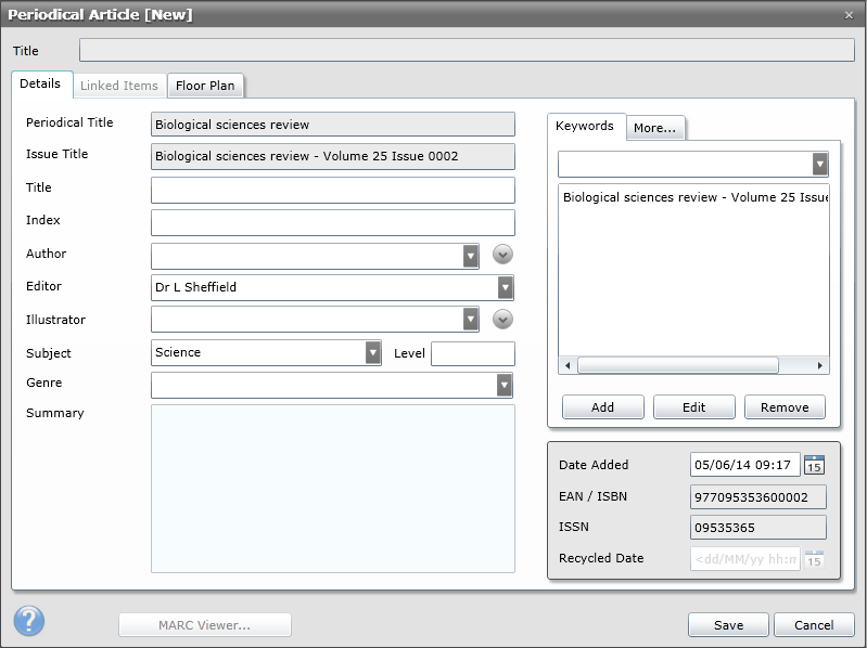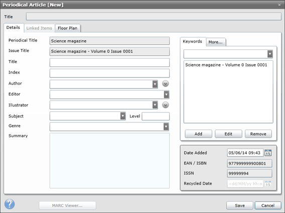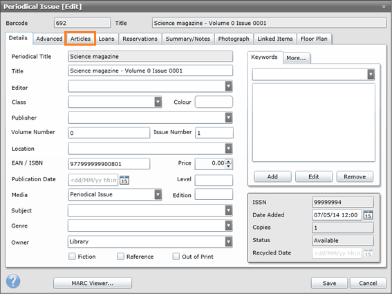 ·Click Save to return to the Periodical Issue window. Add any further Periodical Articles as required and click Save.