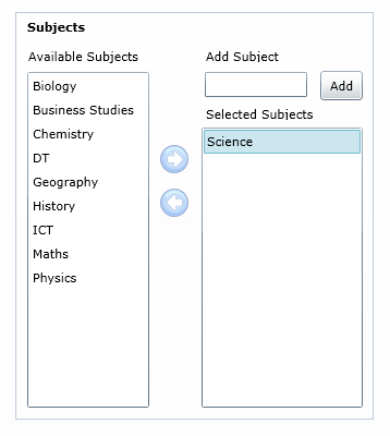 To add a subject, click one from the Available Subjects lists and click right arrow to move it under Selected Subjects. In the example below, we have marked Science as a selected subject.