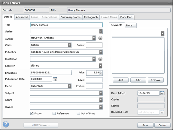 From the record card various details about the item can be entered, fill these in as desired by typing in the text boxes or selecting data from the drop down menus.