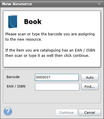 ·Stick the appropriate barcode number onto the physical resource and then scan it using the barcode scanner. Alternatively, type the number into the Barcode text box manually or press Auto so the system can automatically assign one.