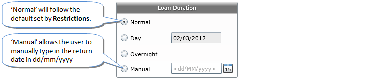 To change the loan period of the resource that is being issued, select the relevant option from the Loan Duration area within the Circulate screen. The ability to set the loan duration can be helpful in one-off cases. Should you wish to alter the loan duration permanently, MLS recommend you alter the Restrictions.