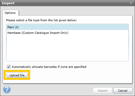 You can import a US MARC (.mrc) or UK MARC (.ukm) file into the custom catalogue. The instructions below demonstrate how to do this.
