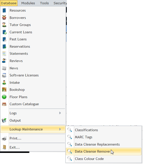 Data Cleanse Remove is a database which allows the user to add words that will not be displayed in the resource or borrower record cards. This means that when a resource or borrower has been added to the system, and includes a word listed in Data Cleanse Remove table, the word is automatically erased from it's context.