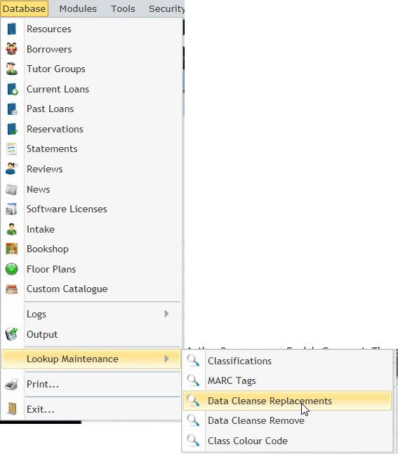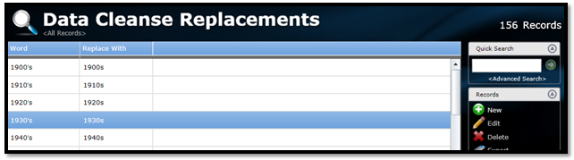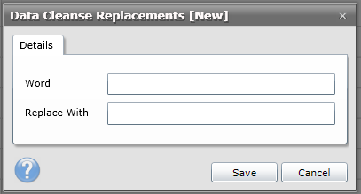 Data Cleanse Replacements is a table that the user may add words to, along with a replacement word. This means that when a resource or borrower has been added to the system, and includes a word listed in Data Cleanse Replacements table, the word is automatically changed to the one that has been specified as the replacement here.