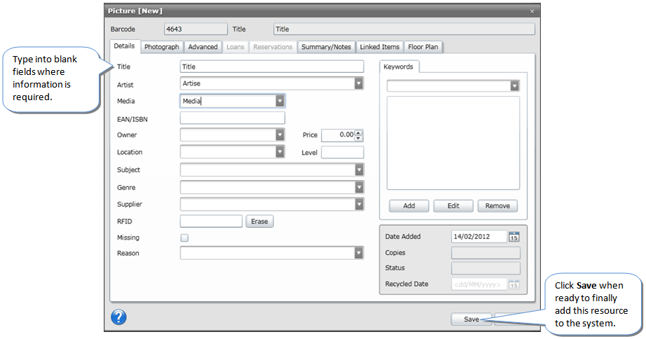 Follow these instructions on how to enter the resource barcode. Please note that with items other than Books the user is not required to enter an ISBN.