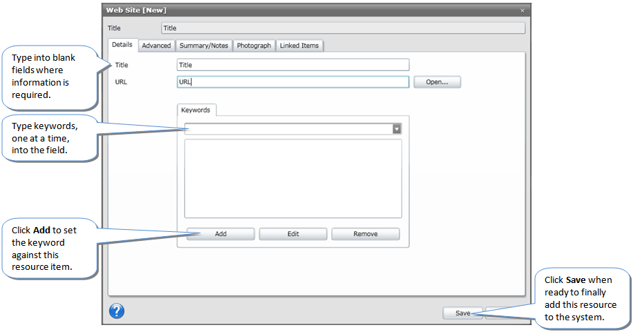 Once the resource record card screen appears, click in each field as required to add information. There are combo boxes and drop-down arrows next to many fields on the screen. Clicking these allows the user to select from a list of previously entered information.