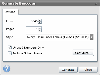 In the From box, enter a number to start from. Should you wish to re-use numbers of books that you have removed, you can enter the lowest number in your current catalogue and then check the "Unused numbers only" option.