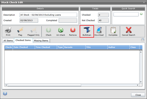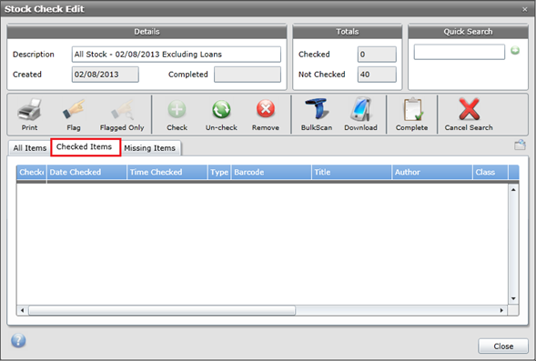 Saving a Stock Check is done automatically for you. When you check an item in, a record of this is immediately saved. Should you wish to close the Stock Check window and need to resume it later, you can click Close or the x. Doing this will not discard any changes you have made to your stock check since it was opened.