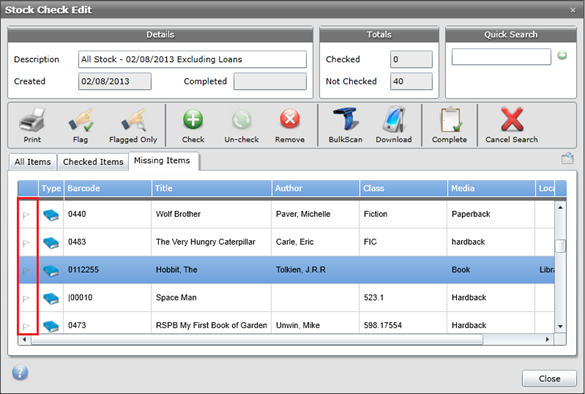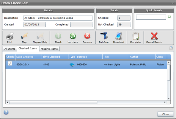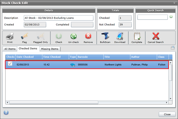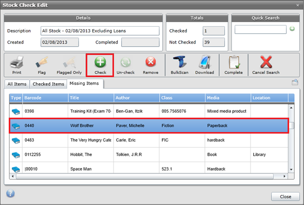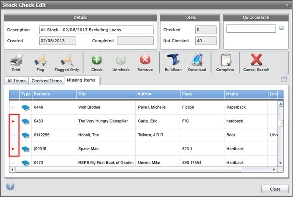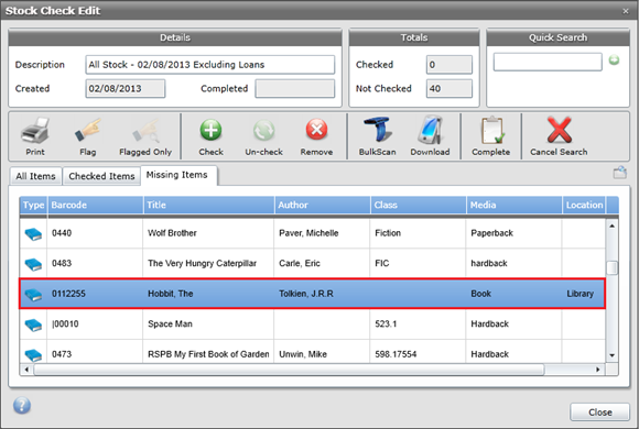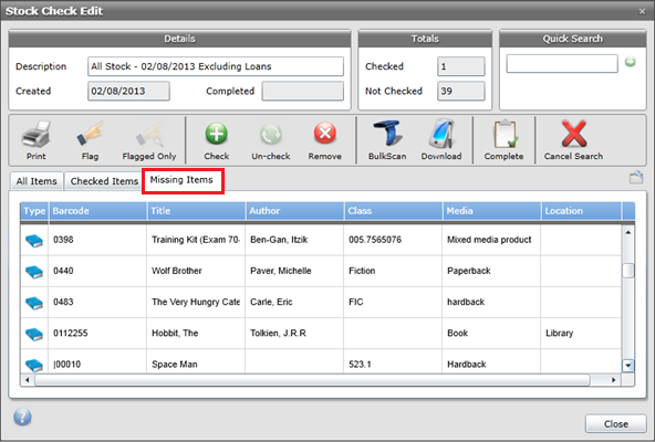 In some circumstances it may be desirable to move items from the Checked Items list to the Missing List. For example, an item is scanned as it is on the shelf but you then decide to discharge the item from the library due to it being damaged.