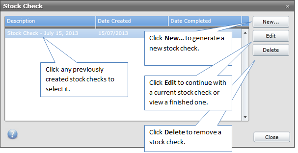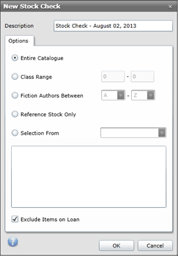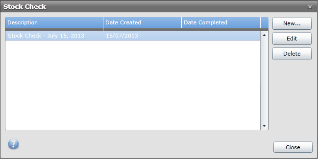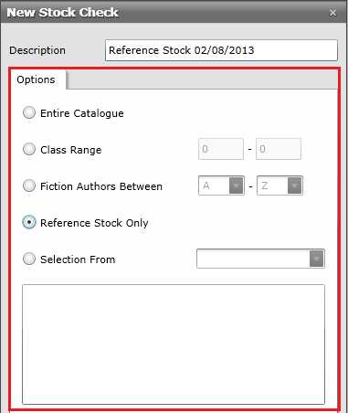 ·Firstly, type in a description into the Description text box. It is advised to enter something that accurately describes the created stock check, for example, "Reference 02/08/2013" if the stock check is only going to be based on reference books.